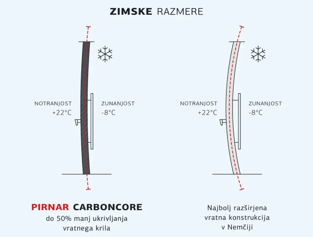 Zaradi manjše možnosti deformacij tudi pri izjemnih dimenzijah vrat so vhodna vrata Pirnar idealna izbira za vse podnebne razmere – od alpskih in skandinavskih do sredozemskih in puščavskih. *Primerjava s trenutno najbolj razširjeno konstrukcijo vrat v Nemčiji. Ocena na podlagi rezultatov internih laboratorijskih meritev.