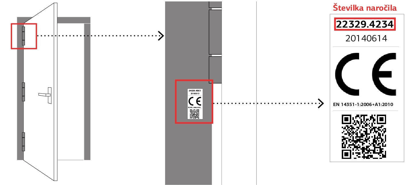 Vaša izkušnja z uporabo Pirnarjevih vrat nam veliko pomeni, zato vam želimo težave odpraviti čim hitreje in čim bolj učinkovito. Najlažje nam boste pomagali, če izpolnite obrazec v nadaljevanju strani ter mu priložite CE nalepko ali QR kodo z vaših vhodnih vrat, kot je prikazano na sliki spodaj.